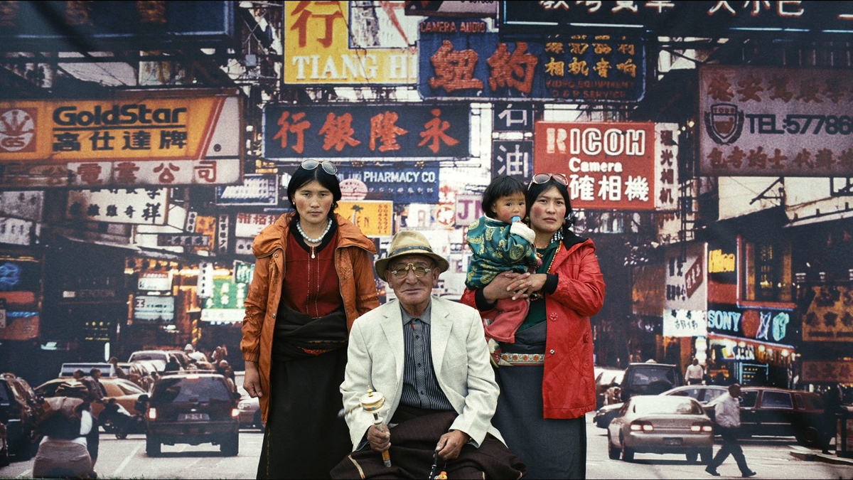 Un jeune photographe ambulant et son assistant proposent à des nomades tibétains de les prendre en photo devant différents fonds. |